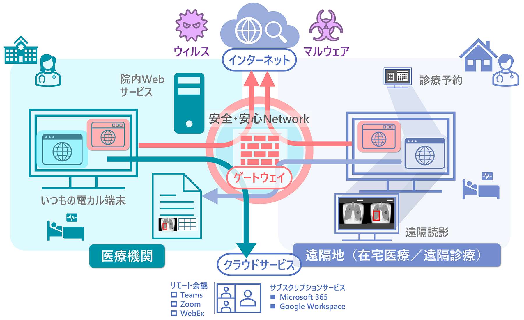 医療機関に導入することで、診療系端末にインターネット接続機能を安全に統合でき、別端末の用意やアカウントの切替といった運用負担を削減できます。